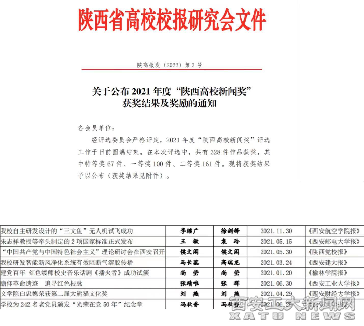 (本网讯)2021年度“陕西高校新闻奖”评选结果揭晓,我校报送的参评作品中6件获奖。其中,张靖唯撰写的《瞻仰革命遗迹 追寻红色根脉》获消息类特等奖,周嘉禧创作的《红歌献党 声动西工 西安工大别样“党课”燃情唱响》、仇倩倩撰写的《学校召开2021年精神文明建设工作会议》获消息类二等奖;毛逸彬撰写的《以梦为马 以师为幸》获通讯类一等奖、杨飞创作的《有一种初心叫医者仁心》获通讯类二等奖;潘欢婷拍摄(解军强指导)的...