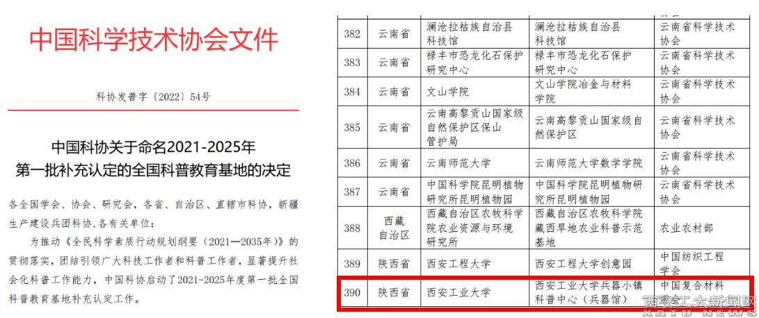 (本网讯)近日,中国科协发布《关于命名2021-2025年第一批补充认定的全国科普教育基地的决定》,万象城平台,万象城(中国)一站式服务平台“兵器小镇”科普中心(兵器馆)(以下简称“科普中心”)成功入选,这是学校获批的重要国家级科普基地。科普中心始于2017年材化学院创建的“化学科普基地”,于2020年联合校兵器馆正式成立万象城平台,万象城(中国)一站式服务平台“兵器小镇”科普中心,先后获批陕西省科普场馆和科普教育基地(2020)。科普中心现与学校多个学院/部门共同建设...