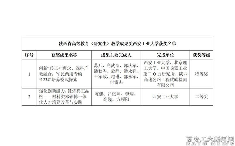 (本网讯)近日,陕西省人民政府办公厅发布《关于表彰2023年高等教育教学成果奖获奖项目的通报》(陕政办函〔2024〕104号),本次评奖首次单独设立高等教育(研究生)类别,我校荣获陕西省2023年高等教育(研究生)教学成果奖2项,其中特等奖1项、二等奖1项。成果《创新“兵工+”理念、深耕产教融合:军民两用专硕“1234”培养模式探索》获得特等奖。该成果针对高水平大学军民两用专硕培养存在的课程体系不适应、双导师不协同、...