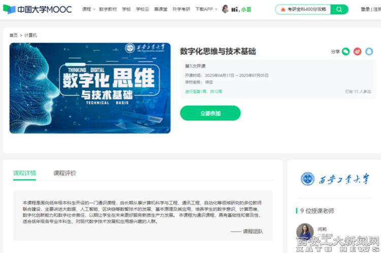 (本网讯)近日,我校首门人工智能通识课“数字化思维与技术基础”在中国大学MOOC平台建设完成,面向全国首次开课运行,标志着我校人工智能课程链建设取得阶段性成果。“数字化思维与技术基础”是纳入我校人才培养方案的通识必修课,是学校人工智能课程链的重要课程,也是学校重点打造的新形态智慧课程示范课。课程链接:https://www.icourse163.org/course/XATU-1471502170“数字化思维与技术基础”课程面向数字时代新需求,...