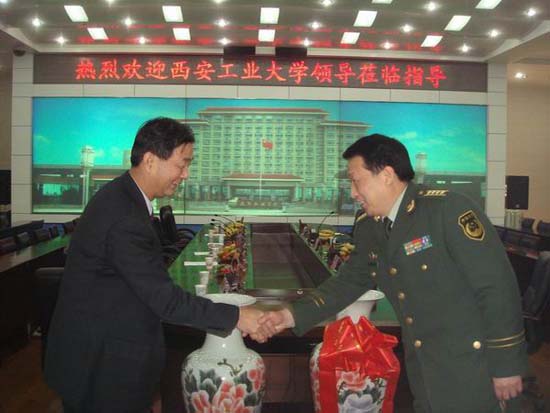 丁养斌副书记一行同武警工程学院训练部副部长张崇俊大校以及武警学院各系的相关人员进行了友好会谈,双方领导发表了热情洋溢的讲话,介绍了各自学校的发展情况和今后的合作意向。丁副书记代表西安工大向武警工程学院赠送了春秋鼎和匾额。