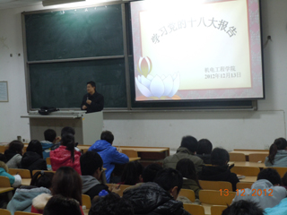 (本网讯)按照校党委《关于认真学习宣传贯彻党的十八大精神的通知》要求,进一步将我校学习贯彻党的十八大精神的工作引向深入。12月13日,机电工程学院在未央校区举办学习 “十八大”精神报告会。机电学院全体学工干部、学生党员、预备党员、积极分子及主要学生干部参加了报告会。