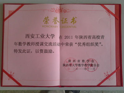 我校推荐的三位教师王预震、高梅、李花妮积极参与并认真准备,均获得2011年陕西省高校青年数学教师“讲课优秀示范奖”,成绩名列我省高校前茅。同时在参加研讨会的20多个高校中,我校和其他3所大学获得“2011年陕西省高校青年数学教师讲课优秀组织奖”。