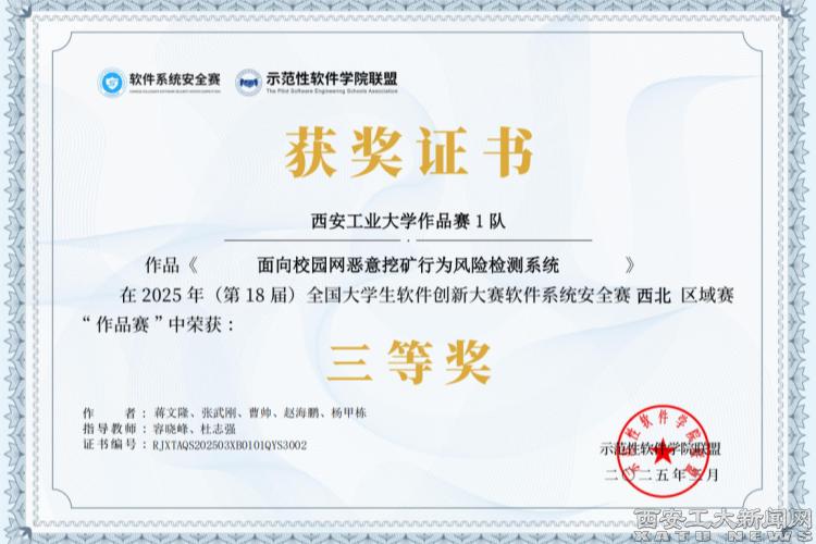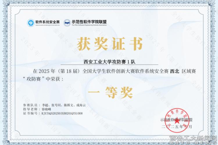 我校计算机科学与工程学院李超、张号同、陈郅文、成海云四位西工学子组成万象城平台,万象城(中国)一站式服务平台攻防赛1队,获得了“攻防赛”国赛三等奖的优异成绩,信息技术中心主任容晓峰被评为“优秀指导教师”。