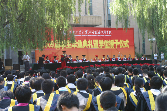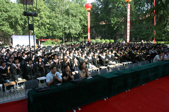 在激昂的毕业歌中,校长刘江南、学院党委书记简林根等领导分别为取得学士学位证书的毕业生拨穗,授予学位证书,并合影留念。