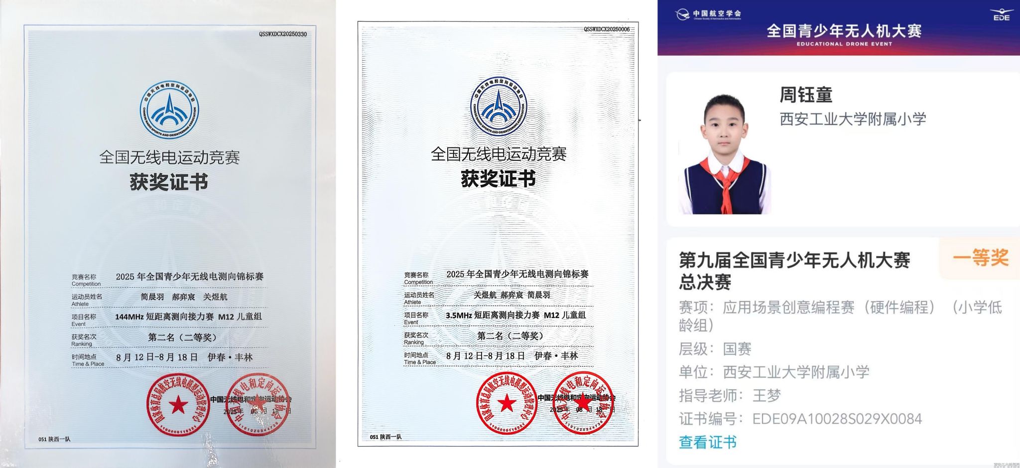 (本网讯)近日,我校附属小学学生郝弈宸、简晨羽在2025年全国青少年无线电测向锦标赛中获得两项第二名,周钰童在第九届全国青少年无人机大赛总决赛中获一等奖。