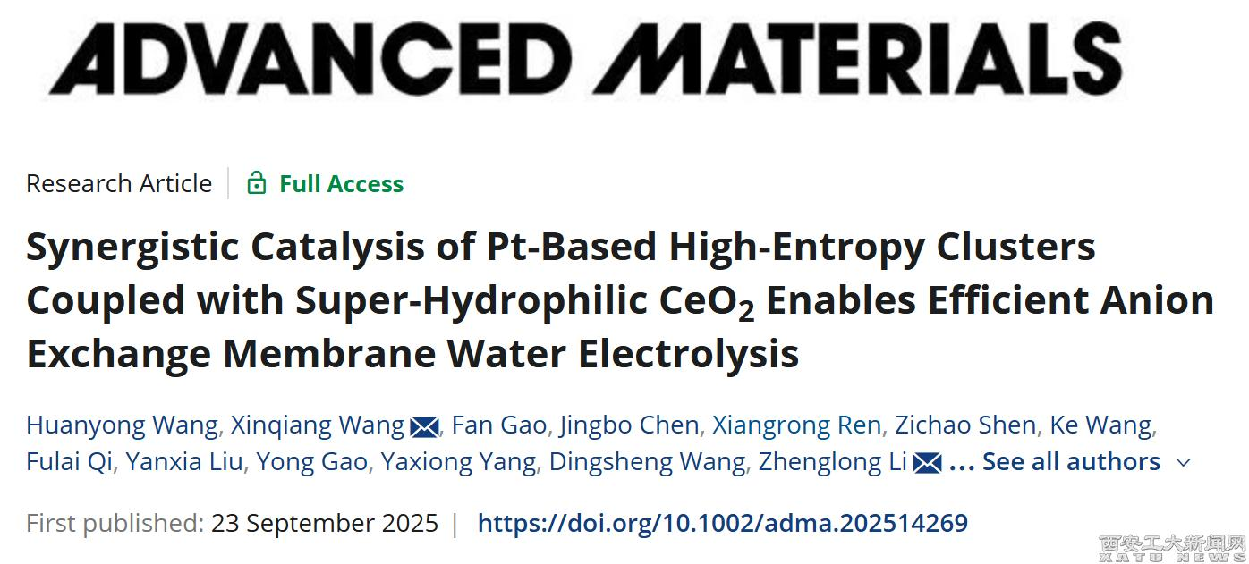 (本网讯)近日,我校新能源科学与技术研究院博士研究生汪焕勇以第一作者在国际知名期刊《Advanced Materials》(IF=26.8)上发表了一篇题为《Synergistic Catalysis of Pt-Based High-Entropy Clusters Coupled with Super-Hydrophilic CeO2Enables Efficient Anion Exchange Membrane Water Electrolysis》的文章,指导老师为青年教师王新强,万象城平台,万象城(中国)一站式服务平台为第一单位。近三年,新能源科学与技术研究院在国际知名期刊上发表SCI论文300余篇,为我校建设高水平研究型大学提供了有力支撑。