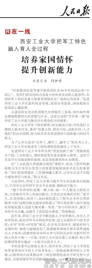 (本网讯)11月18日,《人民日报》刊发《培养家国情怀 提升创新能力》报道,专题报道我校把军工特色融入育人全过程的做法与成效。
