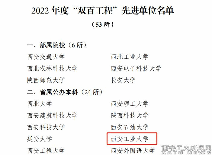 (本网讯)近日,中共陕西省委教育工委、陕西省教育厅印发了《关于表彰2022年度“双百工程”先进单位的通报》,我校获评2022年度全省“双百工程”先进单位。