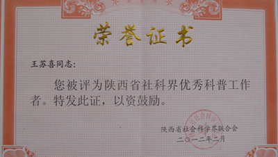 根据《陕西省社科界优秀科普工作者、优秀科普读物评选条件》,历时半年,经过组织申报、专家评审等程序,全省哲学社会科学界共有15名专家被评为“陕西省社科界优秀科普工作者”。王苏喜教授的当选,体现了我校在哲学社会科学研究和宣传普及方面的影响与实力,将对推动我校哲学人文社会科学的发展产生较大的影响。