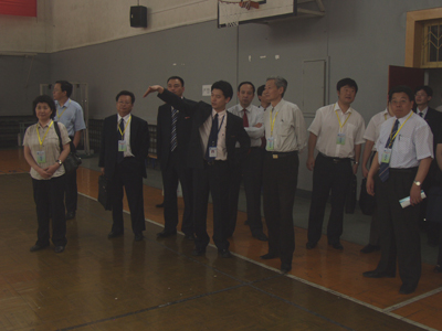 5月14日下午14点30分,教育部评估专家组一行在校党委书记赛云秀、校长刘江南、副校长张君安、刘卫国、校长助理陈桦等学校领导的陪同下考察了我校金花校区体育场馆设施状况。体育系主任谷崎、副主任陈亚麟向评估组专家就体育场馆设施的功能和利用情况作了详细的介绍。