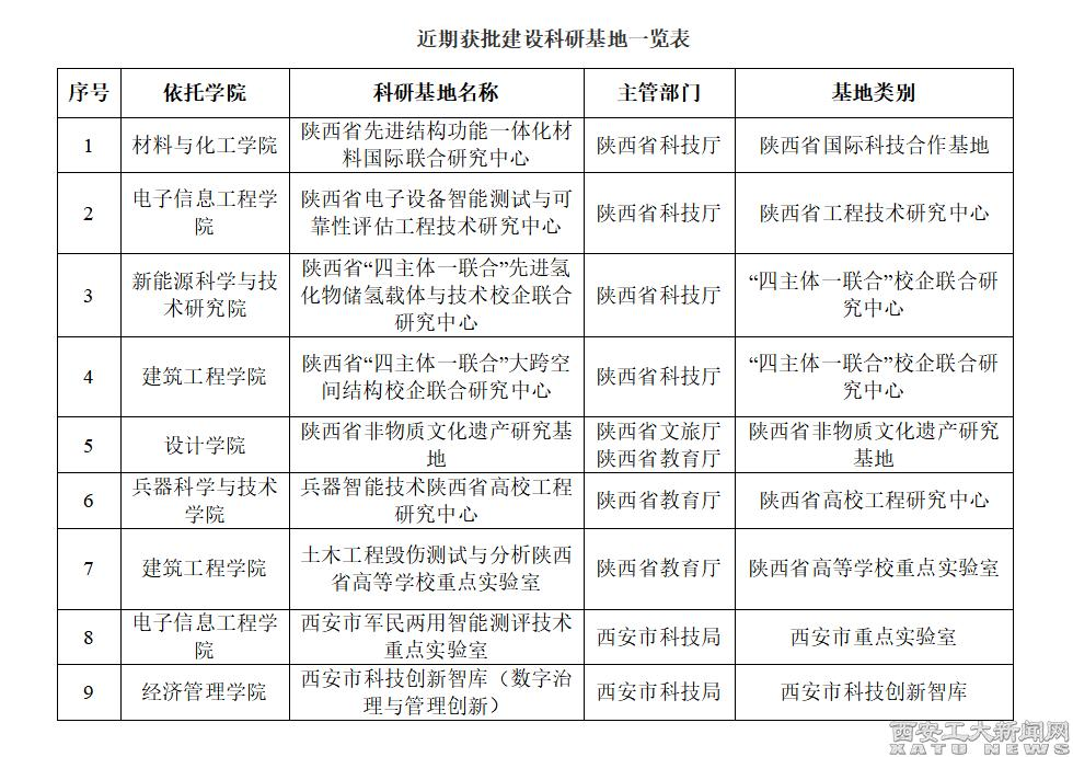 (本网讯)近日,陕西省科技厅、陕西省教育厅、陕西省文旅厅、西安市科技局陆续公布了多个类别的科研基地批准建设名单,我校共获批9个,其中陕西省国际科技合作基地1个、陕西省工程技术研究中心1个、陕西省“四主体一联合”校企联合研究中心2个、陕西省非物质文化遗产研究基地1个、陕西省高等学校重点实验室1个、陕西省高校工程研究中心1个,西安市重点实验室1个、西安市科技创新智库1个。