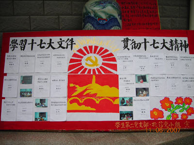 会后,06北信党小组以板报的形式在校园展出了同学们的学习心得体会。