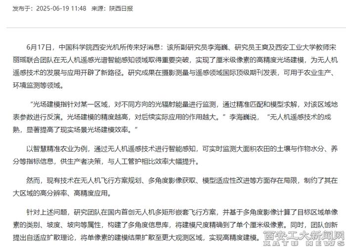 (本网讯)近日,《陕西日报》刊发消息,中国科学院西安光机所副研究员李海巍、研究员王爽及我校人工智能与数据科学研究院教师宋丽瑶联合团队在无人机遥感光谱智能感知领域取得重要突破,成功攻克厘米级像素高精度光场建模难题,为无人机遥感技术的拓展应用注入了强劲动力。相关成果发表于遥感领域一区TOP期刊ISPRS Journal of Photogrammetry and Remote Sensing(SCI 1区TOP,IF=10.6)。
