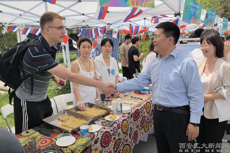 活动现场,“环球文化大观园”热闹开市。来自20余个国家的留学生代表身着民族服饰,通过传统美食、手工艺品、民族乐器及互动游戏展示本土文化。校领导和嘉宾走进各国展区,亲切与留学生代表交流互动。