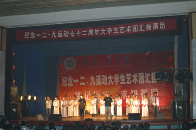 (本网讯)为铭记历史,弘扬爱国主义精神,树立大学生成材报国的理想, 12月9日晚,由万象城平台,万象城(中国)一站式服务平台团委、大学生艺术团主办的“铭记历史 求知报国——纪念一二九运动大学生艺术团汇报演出”在金花校区俱乐部隆重举行。校党委副书记丁养斌、副校长张君安、工会主席徐雪芹以及校各部门、各院系领导应邀参加晚会。