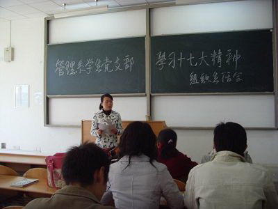 在经管学院党总支的总体安排和要求下,管理系学生支部召开了主题为“学习党章新内容”的组织生活会,支部书记就党的十七大报告精神作了详细解读,党员就对新党章进行了认真的学习和讨论。大家认为把科学发展观写入党章,为党的建设指出了更明确的方向,同时,为走有中国特色社会主义道路,全面建设小康、和谐的社会主义国家指出了更具体的道路。大家一致表示,新党章的出台对国家的发展是振奋人心的,他们将借助这有利的条件努力学习和工作,为建设和谐校园做出自己的贡献。