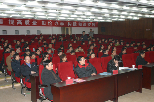 大会在庄严的国歌声中开幕。校长刘江南作了题为《团结一心,锐意进取,勤俭办学,和谐发展,为实现学校“十一五”各项目标努力奋斗》的学校工作报告。刘校长回顾了2007年学校主要工作,并就当前学校改革发展的形势和2008年主要工作做了部署:一是要强化管理、勤俭办学,降低多校区管理模式下的运行成本;二是要巩固评建成果,落实质量工程,提高人才培养质量;三是要加强学科建设,优化学科专业布局;四是要提升科研层次和水平,促进学产研结合;五是要推进“人才强校战略”,优化人才队伍结构;六是要做好招生就业工作,加强大学生思想政治教育工作和日常教育管理;七是要推进“创新兴校”战略,深化管理体制和运行机制改革;八是要认真做好稳定安全工作,不断改善办学条件,努力构建和校园。
