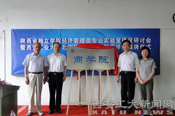 张君安、西安交通大学城市学院副院长崔杜武、广东商学院经济与管理国家级实验教学示范中心主任任晓阳和张萍共同为商学院揭牌。