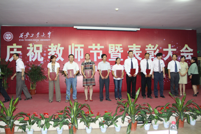 在随后的表彰仪式中,于孟晨副书记宣读了上级关于表彰省级师德先进集体、先进个人的通知。机电学院荣获 “陕西省普通高校师德先进集体”称号、体育学院刘鹏老师荣获“陕西省普通高校师德先进个人”称号。党委书记赛云秀、校长廉振民分别给他们颁发证书,学生代表敬献了献花。