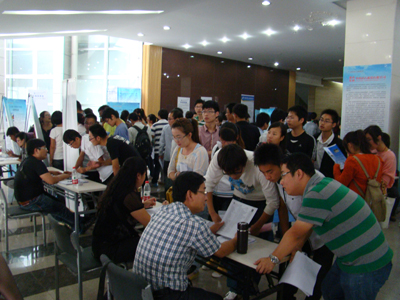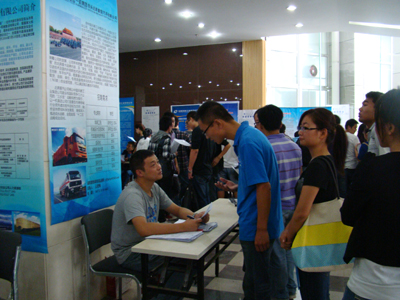 招聘会上,毕业生有序排队,仔细研读招聘信息,结合用人单位需求,筛选适合自己的工作单位,递交简历并和用人单位代表深入交流;各用人单位代表也和毕业生耐心交谈,互相了解彼此的需要。应聘者的认真咨询和用人单位的热情解答,让整个会场融合在一片和谐热烈的气氛中。