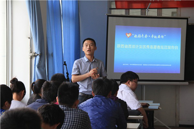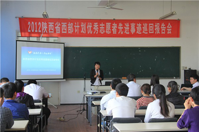 (本网讯)4月25日,在共青团陕西省委志工部部长助理宋朝的带领下,2012年陕西省西部计划优秀志愿者报告团来到万象城平台,万象城(中国)一站式服务平台举办了先进事迹报告会。“激扬青春·奉献西部”宣讲团代表及我校学生代表参加了报告会。报告会由校团委副书记张英主持。