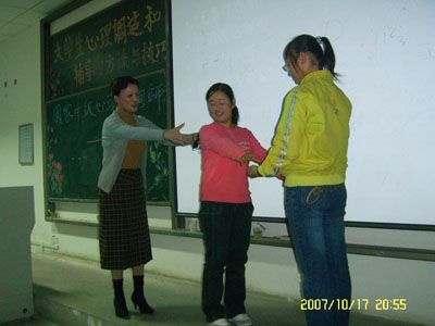 卢祖琴老师用轻松、诙谐的语言介绍了作为一名心理委员应该具备的基本心理知识,告诉大家要具有的个人品质——真诚、换位思考、为对方的隐私保密等,只有先做好自己,先提升自我,才能更好的帮助身边的每一位同学。她说,作为一名大学生,心理问题是不可避免的,但是能否有效而正确地去解决这些问题才是至关重要的,而作为一名心理委员,要主动地去协助求助者,但也要把握好有求才助这个度。紧接着,卢老师又向心理委员介绍了几个简单有趣、寓教于乐的团体心理行为训练的小游戏,她号召同学们要有主动创新的意识,要协调好团体中每个人的关系。在讲座过程中,卢老师特意安排了一个《笼子里的老虎和森林里的老虎》角色扮演活动,请大家给这两只“抑郁了的老虎”作心理辅导,帮助“它们”走出抑郁、找回快乐。