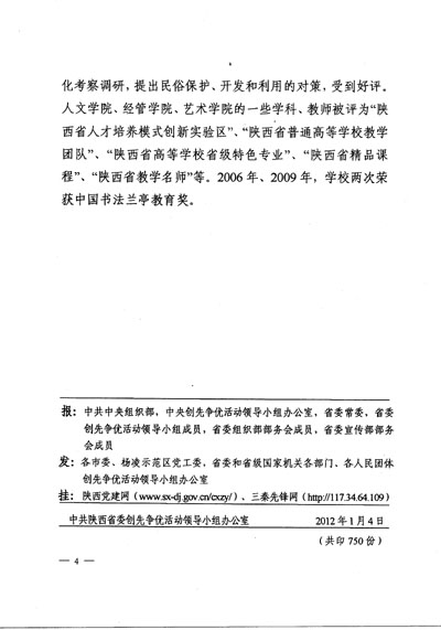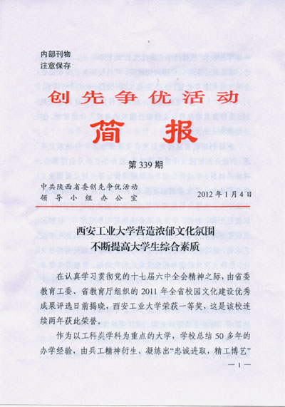 去年以来,学校党委以创先争优活动实施细则为指南,以党建评价为载体,以庆祝建党90周年为重点,策划、开展了丰富多彩的创先争优特色活动,受到省委、省教育系统以及媒体的关注。省委党建办、基层办副主任、省委创先争优活动办公室副主任朱峰听取了学校创先工作汇报,并肯定学校党委创先争优工作思路和做法。省教育系统创争简报(2011年第8期)专题刊载了我校典型经验。《当代陕西》、《陕西日报》、《消费日报》、《现代军工》、西部网等媒体以及省教育厅网站多次报道了我校开展的创先争优活动。