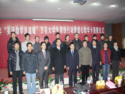 随后,省学联副秘书辛长辛磊介绍了团省委开展全团送温暖工作的开展情况。从捐赠方、活动的筹划到实施、捐赠对象的评选等方面作了全面的介绍。然后与会领导向学生代表发放网上英语学习爱心助学卡。张小平副书记为四海嘉华科技有限公司颁发锦旗。我校经管学院学生李永平作为受助学生代表发言,他非常感谢团省委以及学校的关心——通过发放爱心学习卡帮助他以及像他一样英语不好的贫困生,同时也非常感谢四海嘉华科技有限公司的捐助和支持,有了这些帮助,他们将在今后的英语学习过程中更加努力,提高自己的英语成绩,在以后的工作中,用今日之所学回报社会。