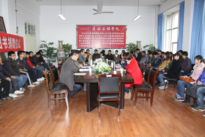 6日下午,于副书记出席了在建筑工程学院会议室举行的由党委组织部、宣传部、校工会组织的学生党支部书屋图书捐赠仪式,并讲话指出:进一步加强“支部书屋”建设,贯彻了创先争优活动的内在要求,践行了党的十七届六中全会精神,是我校文化育人,全面提高人文素质的有力补充。他从理论与实践的结合上,阐释了读书学习、文化传承的重要性,强调了精神文化的引领作用,并勉励学生多读书、读好书,要求师生继续深化教书育人、读书育人。