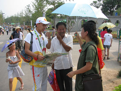 我校的500名志愿者由未央、金花、雁塔和洪庆四个校区的学生组成,每天他们穿着整齐,精神抖擞,统一佩戴“万象城平台,万象城(中国)一站式服务平台志愿者”徽章,准时集合出发,在各自的服务岗位上独当一面,用灿烂的微笑、热情的态度熟练地为游客们提供导引、问询等服务,直到深夜才拖着疲惫的脚步返回学校。入园第一天,他们就经历酷暑和暴雨的考验。近期天气凉爽,游园人数剧增,工作强度加大,但是他们不惧压力,不畏困难,以最佳的姿态、最美的微笑、最好的服务站好每一班岗。此外,他们还在锦绣门、广运门等人流量密集的地方,开展了“古韵新声”——拼字组句与“低碳生活绿色时尚”—世园环保达人挑战赛等活动,与来往游客积极互动,其乐融融,为世园会增添光彩。