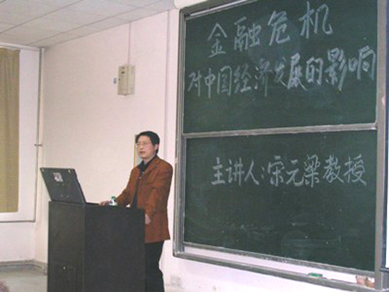 宋元梁教授从三个方面帮助大学生分析了金融危机对中国经济发展的影响。首先为大学生们讲解了马克思主义关于金融危机和经济危机的相关理论,就目前美国金融危机的产生背景及其对美国经济的影响进行了详尽的分析,随后为大学生们介绍了此次美国金融危机给世界经济带来的影响,最后结合中国经济的现状,客观地分析了金融危机对中国经济的影响,。