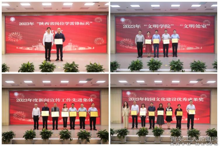 校领导分别为获得2023年“陕西省岗位学雷锋标兵”,学校“文明学院”“文明处室”、新闻宣传工作先进集体和校园文化建设优秀成果奖的代表颁奖。