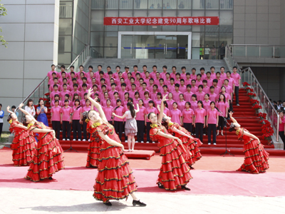 歌咏比赛在一支燃烧着炽热情怀的开场舞《红色激情》中开场,现场所有师生的热情被瞬间点燃。接着,机关一总支和机关一工会8名老师带来配乐诗歌朗诵《放歌西工,为党祝福》,他们回顾了我校的发展历程,重温了我校的光荣历史,抒发了深厚的爱校、爱党情怀,随后比赛正式开始。