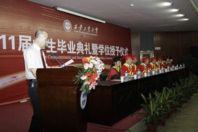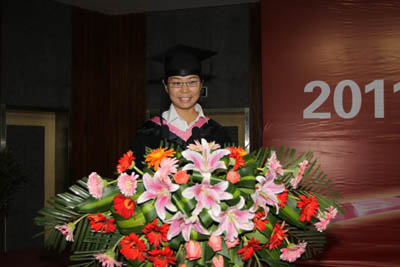 外国语学院2011届毕业生孟迪同学代表全体毕业生发言,她说:全体毕业生将共同相约,不辜负西安工大的培养,不辜负老师的教诲,努力践行“忠诚进取、精工博艺”的办学传统,在各自的岗位上努力工作,争做国民表率、社会栋梁,为西安工大争光,同时祝愿母校桃李满天下,全体教师身体健康,祝愿全体学弟学妹学业有成。