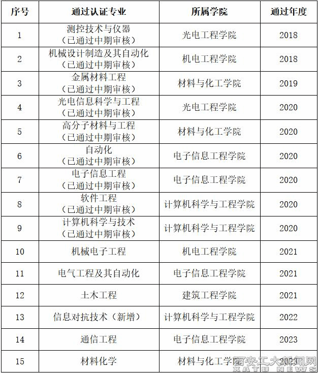 (本网讯)近日,中国工程教育专业认证协会发布了《关于公布天津工业大学机械工程等441个专业认证结论的通知》和《关于公布北京交通大学机械工程等398个专业工程教育认证中期审核结论的通知》,我校“通信工程”和“材料化学”2个专业顺利通过认证(有效期6年),“光电信息科学与工程”“高分子材料与工程”“自动化”“电子信息工程”“软件工程”“计算机科学与技术”等6个专业通过有效期内中期审核。截止目前,我校共有15个专业正式通过工程教育认证,其中9个专业通过有效期内中期审核。