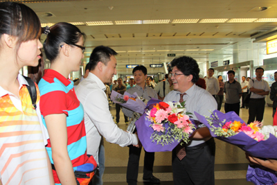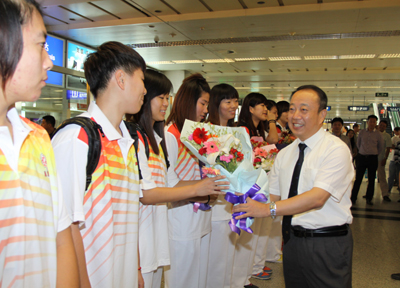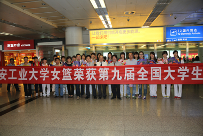 (本网讯)9月19日上午,代表陕西省出征中华人民共和国第九届大学生运动会的校女篮载誉归来。校党委副书记于孟晨,副校长张君安代表全校师生在西安咸阳国际机场迎接代表团一行。