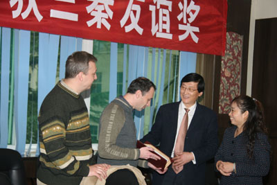 西安工大副校长刘卫国主持颁奖仪式,校长刘江南、白俄罗斯无线电信息大学光学专家基玛·格罗索夫博士、谢尔盖、安吉拉等专家、中白(中华人民共和国陕西省人民政府与白俄罗斯教育部)高技术合作研究中心负责人出席颁奖仪式,西安工大国际交流与对外合作处、科技处和外语系负责人参加了仪式。