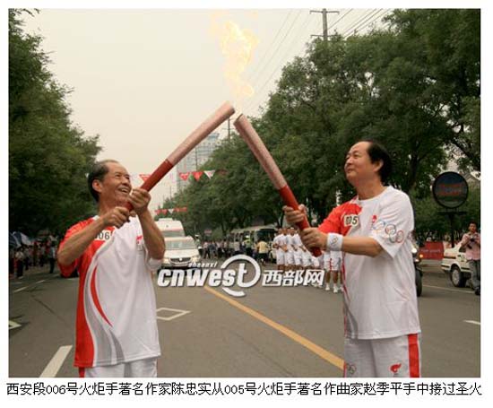 传递后,陈忠实先生说:“火炬手经历对人心理和精神上都是很重要的补偿,我感受到了这神圣之光、神圣之火,对人的心理是一种强化,可以更好地面对世界,面对自己。”