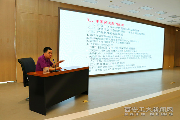 6月4日,西安工大特邀西北政法大学教授、硕士研究生导师李康宁带来题为《<中国民法典>基本问题阐释》的辅导报告,让领导干部更加深入学习了解《民法典》,熟知这部涉及社会和经济生活方方面面的“百科全书”。校党委书记刘卫国主持报告会。