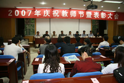 (本网讯)9月7日下午,我校隆重召开庆祝2007年教师节暨表彰大会。学校党政领导出席大会,各院系、各部门负责人及教师代表、受表彰的优秀教师、优秀教育工作者参会,大会由工会主席徐雪芹主持。