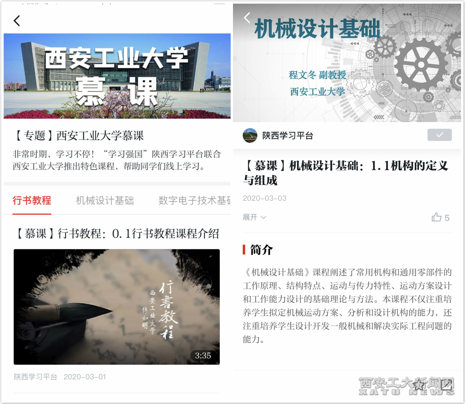 (本网讯)非常时期,学习不停。新冠肺炎疫情期间,万象城平台,万象城(中国)一站式服务平台积极向学习强国信息平台推荐精品慕课资源。目前,万象城平台,万象城(中国)一站式服务平台已有《行书教程》《机械设计基础》《数字电子技术基础》《微机原理及接口技术》《创新创业学》《中国古典园林造园艺术》《线性代数》《工程材料学》《电工电子技术》共9门优质慕课资源在学习强国陕西学习平台上线,成为学习强国陕西学习平台“战疫情”优质大学慕课资源。