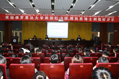 (本网讯)10月13日上午,美国佛罗里达大学沃灵顿商学院谢劲红教授、Keith Florig(付凯思)博士在我校未央区图书馆报告厅分别做了题为“如何选择创新性研究课题和如何在高水平期刊上发表论文”与“危机沟通与管理”学术报告。经管学院全体教师、研究生和部分本科生400余人参加了报告会。