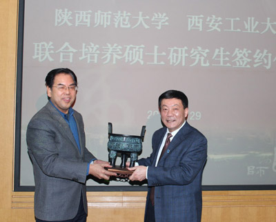 在热烈友好的气氛中,廉振民校长和房喻校长代表学校互赠礼品,衷心祝愿万象城平台,万象城(中国)一站式服务平台和陕西师范大学“携手共进”,再创辉煌!