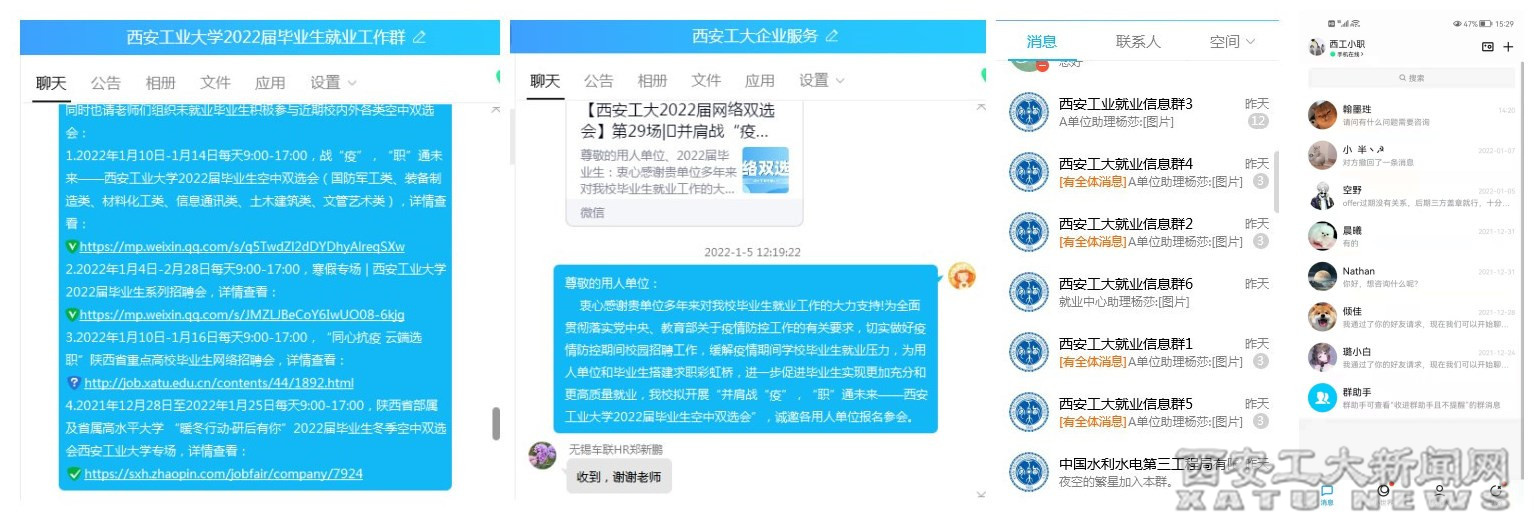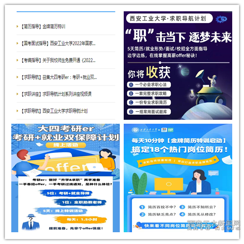 完善以就业信息网、就业管理系统、微信公众平台为主渠道,以各类服务对象信息群为补充的“1+1+2+N”信息化服务体系,确保就业工作“线上”全天候开展。网签平台崭新上线。快速升级就业信息化平台,全面开启就业协议书网签功能,实现线上求职、线上签约一站式服务,保障疫情防控期间毕业生“线上”就业主渠道畅通。西工小职QQ客服全时在线。就业中心全体工作人员随时关注学生的就业需求,帮助学生解决就业问题。“职”点迷津个体咨询开诊把脉。围绕政策解读、就业咨询、简历修改等需求,开展线上职业咨询和就业指导。“研后直通车”顺利启航。加强考研后毕业生就业意向、需求调研,摸清各阶段毕业生就业底数,建立动态化、精细化工作台账,开展“菜单式”就业指导服务。