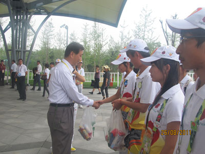 丁养斌副书记讲话对我校志愿者前期服务的成果表示了肯定,对志愿者们在高温烈日及阴雨连绵的天气下坚守岗位热情服务的精神给予了高度赞扬,还向8月25日在雷电冰雹天气中有序疏导游客避雨的志愿者们提出表扬。他说:“在志愿服务期间充分展现了西安工大优秀校风的志愿者,你们的服务精神在实践中得到了更加深刻的认知,这样的经历会是伴随一生的宝贵财富!世园会因你们而美丽,西安因你们而美丽。”志愿者们用热烈的掌声表达了对校领导的衷心感谢。随后,校领导为志愿者们分发了慰问品,并与志愿者们合影留念。