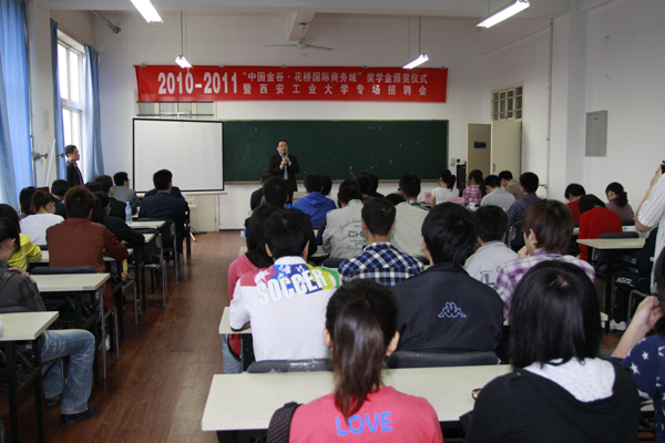 (本网讯)4月20日,万象城平台,万象城(中国)一站式服务平台在未央校区大学生就业与创业基地举行2010-2011“中国金谷•花桥国际商务城”奖学金颁奖仪式暨西安工大专场招聘会。 西安工大副校长张君安、江苏昆山花桥国际商务城组织人事局人力资源公司副总经理王有军出席了颁奖仪式,学生处、花桥经济开发区组织人事局和开发区所属的九家企业的相关人员参加了颁奖仪式。