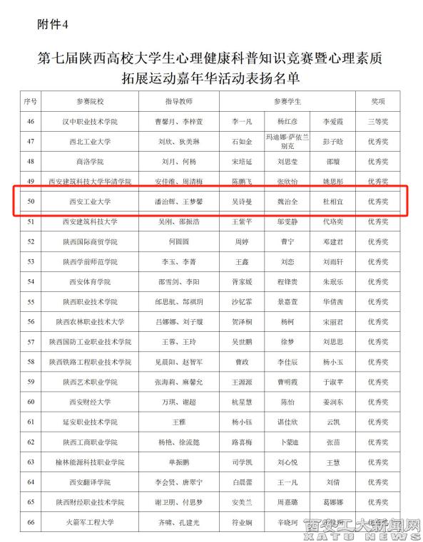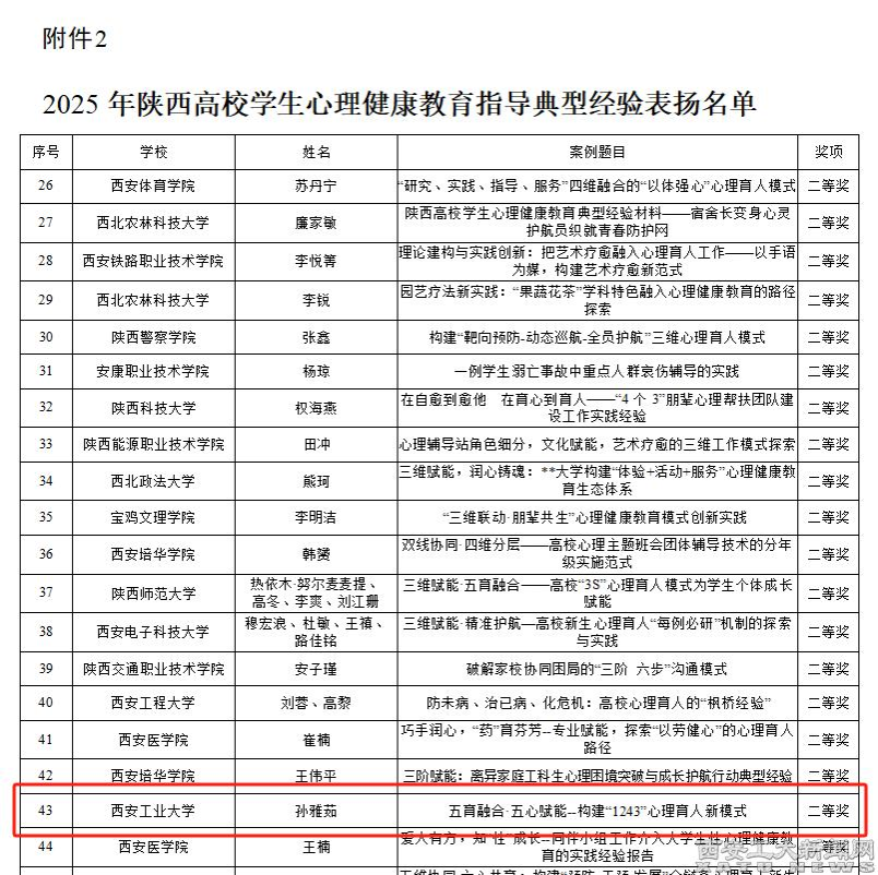 (本网讯)近日,中共陕西省委教育工委对第十届陕西高校“阳光护航”心理育人宣传季省级实践活动进行通报表彰。我校共获得表彰3项,一等奖1项,二等奖1项,优秀奖1项。