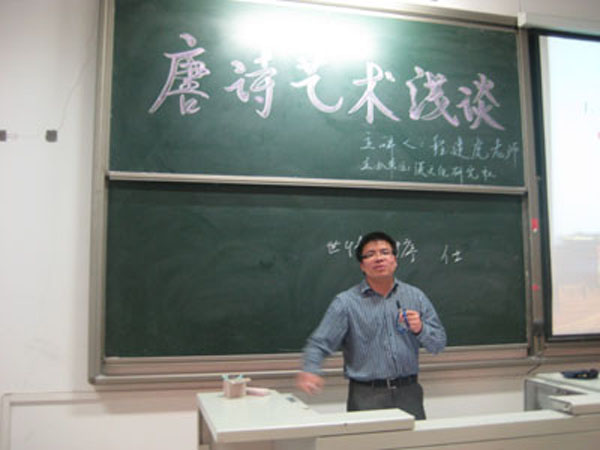 5月6日晚,武汉大学博士程建虎老师为同学们做了题为“唐诗艺术浅谈”的讲座。程老师以自己深厚的文学底蕴吸引了学校各院系同学前来听讲。所讲内容包括唐诗的历史发展,表现手法及艺术赏析等,涉及到古诗百余首。幽默风趣的语言,引人入胜的问题,精彩生动的讲解,博得了同学们的阵阵掌声。讲座结束后,不少同学还意犹未尽地和老师进行面对面的交流与学习。