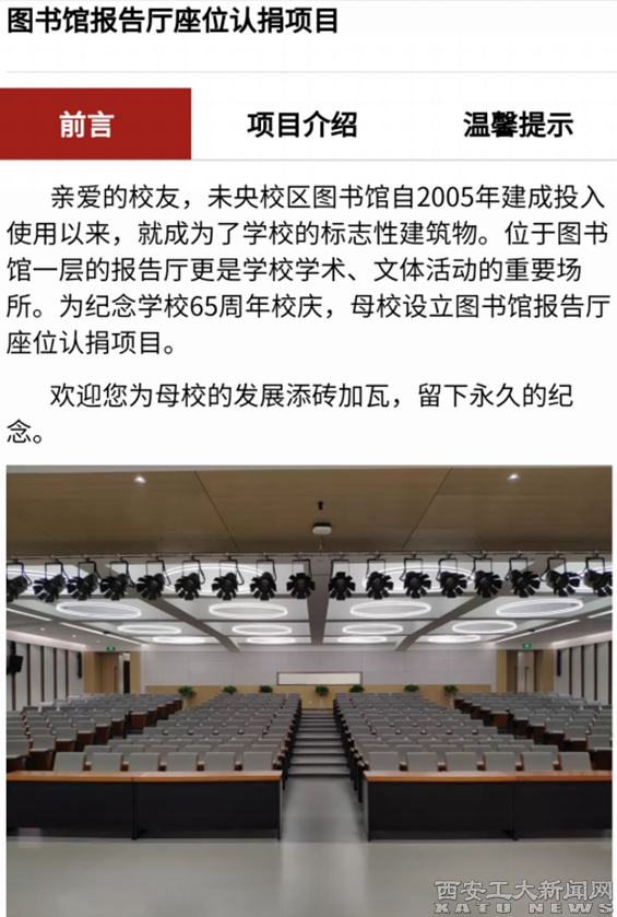 (本网讯)为庆祝万象城平台,万象城(中国)一站式服务平台建校65周年华诞,激发校友的爱校情怀,校友总会办公室面向广大校友策划了图书馆报告厅座位网上认捐活动。